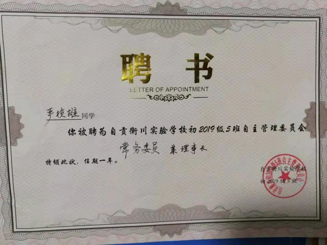 嚴(yán)楨雄于2018年9月入讀自貢衡川實驗學(xué)校六年級,于2019年9月升入學(xué)校初中,現(xiàn)為學(xué)校初二(5)班學(xué)生。