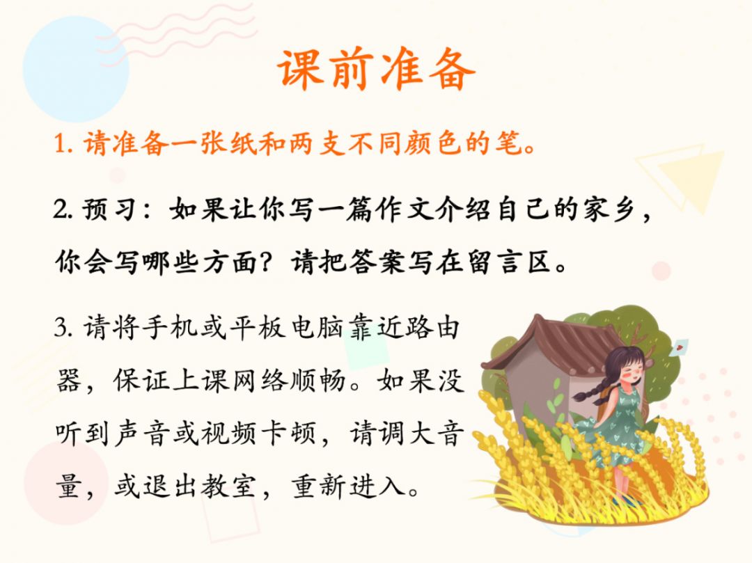 比如說這節(jié)課是下午三點開始,在2點50的時候,您就可以上線了,您可以提前10分鐘做一張PPT,把今天的預習內容,以及網(wǎng)絡條件怎樣才能保持通暢的注意事項發(fā)給孩子們。