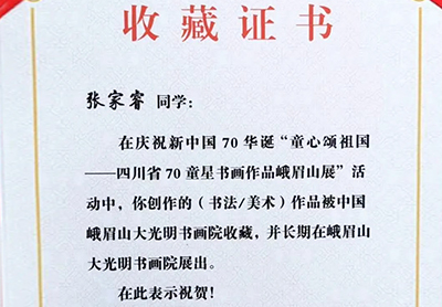 衡川學(xué)子張家睿美術(shù)作品《愛我九州》入選由中國(guó)美術(shù)家協(xié)會(huì)、中國(guó)民族文化藝術(shù)基金會(huì)共同主辦的“...