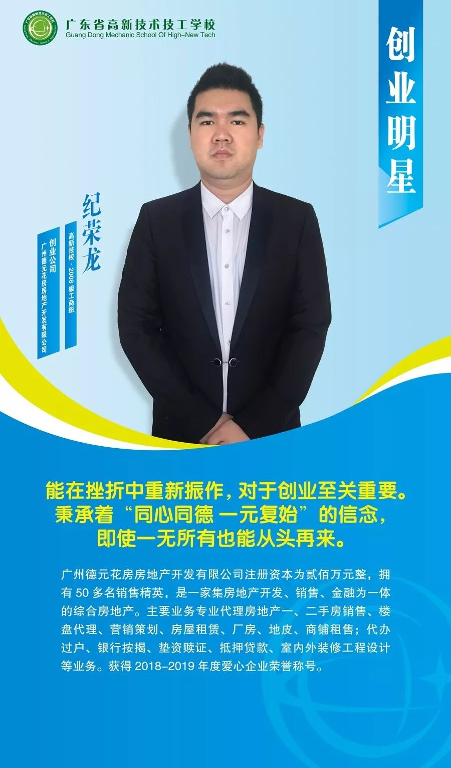 廣東省高新技術(shù)技工學(xué)校涌現(xiàn)出一大批創(chuàng)新創(chuàng)業(yè)的優(yōu)秀校友,今天我們先展示出第一批--10位創(chuàng)業(yè)“明星”,他們不畏艱辛和困難,在創(chuàng)業(yè)路上努力拼搏。
