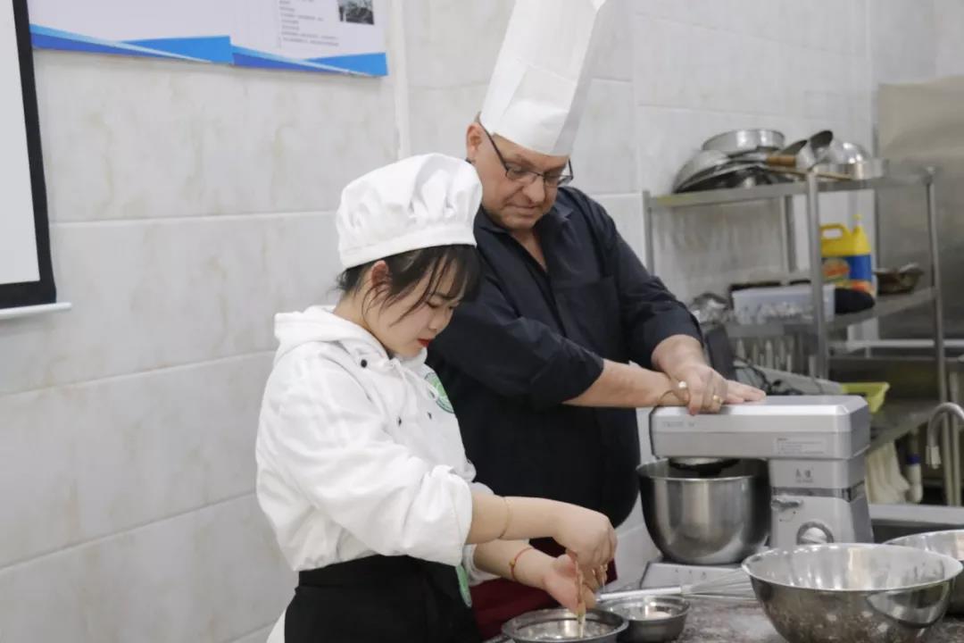 午后,Mr.Stuart一行觀摩烹飪班的面點(diǎn)實(shí)訓(xùn)課,Mr.Stuart興起,決定寓情于教,穿上烹飪專業(yè)圍裙,帶上廚帽,要親自教授18烹飪1的同學(xué)制作巧克力曲奇。EHI 校長(zhǎng)親授,這群孩子有福。