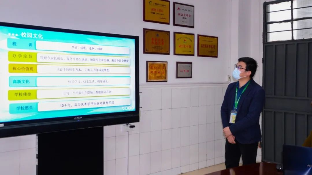 王磊校長助理介紹學(xué)校開設(shè)18個(gè)熱門專業(yè)、培養(yǎng)符合企業(yè)需求的專業(yè)人才等方面的現(xiàn)狀。王忠月副校長介紹高新升學(xué)部從今年春季開始招生,提供多元化升學(xué)途徑,幫助學(xué)子圓大學(xué)本科夢。