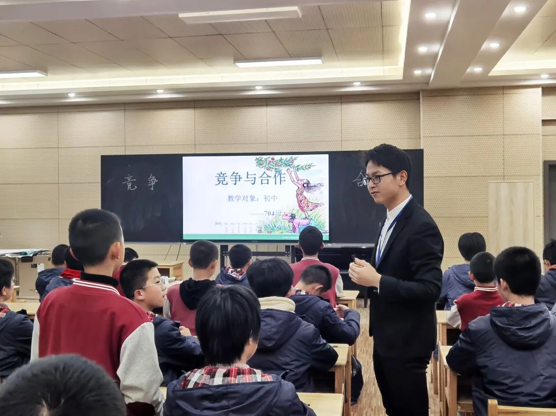 七六班班主任常雪晴老師和七四班班主任李金龍老師,實現(xiàn)了班會課的同題異構(gòu),都已《競爭與合作》為主題,共同探討了競爭與合作的關(guān)系。